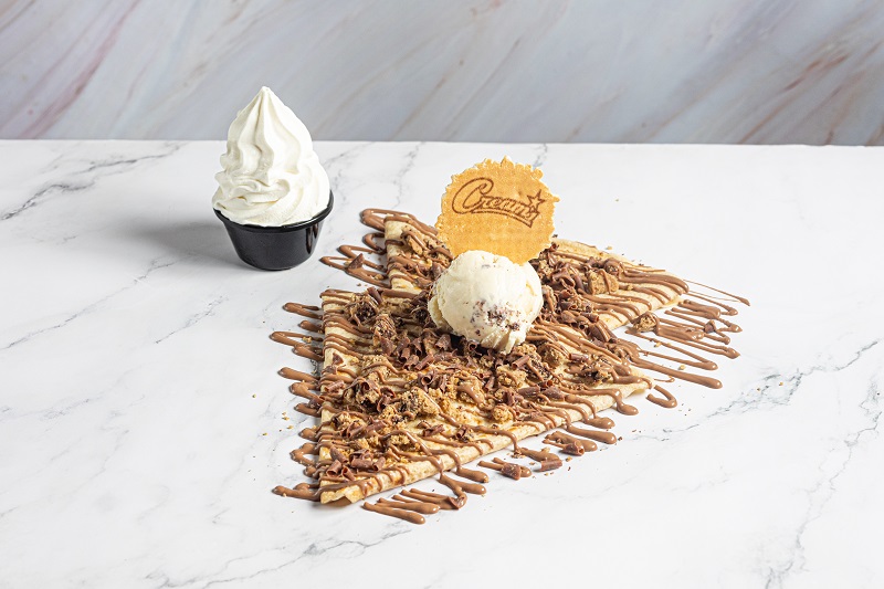 COOKIE CRUSH Crumbled cookie dough, milk chocolate shavings, milk chocolate sauce, cookie dough gelatoand a Creams wafer. (662 kcal)